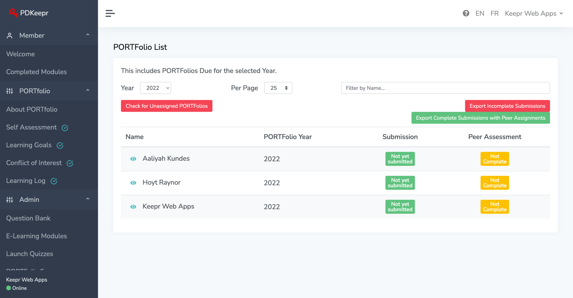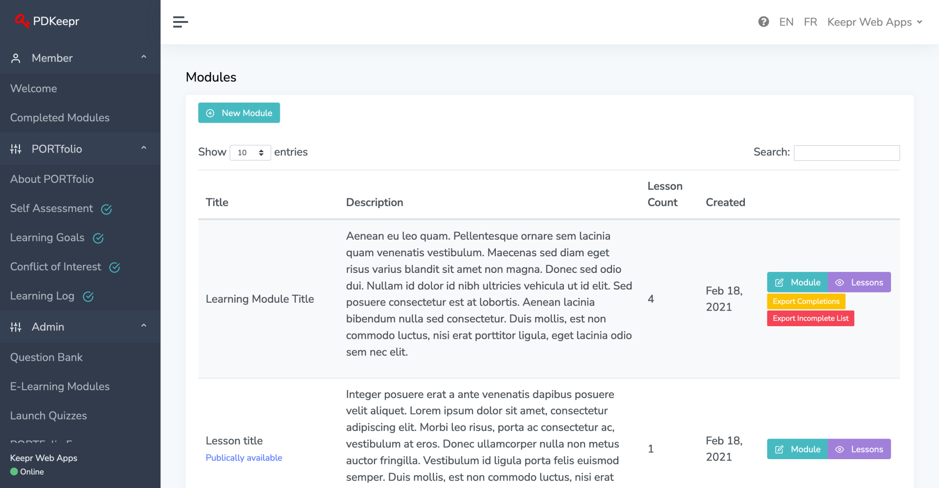 Organizations can view member assessments, completion of learning modules, with the ability export data.